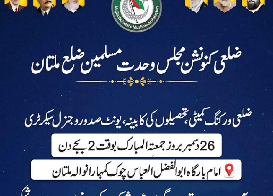 مجلس وحدت مسلمین ضلع ملتان کا ضلعی کنونشن 26دسمبر بروز جمعتہ المبارک کو امام بارگاہ ابوالفضل العباس چوک کمہارانوالہ ملتان میں منعقد ہوگا، ایم ڈبلیو ایم ملتان کے ضلعی آرگنائزر عون رضا انجم ایڈووکیٹ کے مطابق ضلعی کنونشن میں ضلعی ورکنگ کمیٹی، ضلع کی چار تحصیلوں( ملتان سٹی، ملتان صدر، شجاع آباد، جلالپور پیروالا) کی کابینہ چاروں تحصیلوں کے 20سے زائدیونٹس صدورو جنرل سیکرٹریز ضلعی صدر کے انتخاب میں حصہ لیں گے۔ ضلعی کنونشن میں مجلس وحدت مسلمین کے مرکزی، صوبائی اور ضلعی رہنما شریک ہوں گے۔