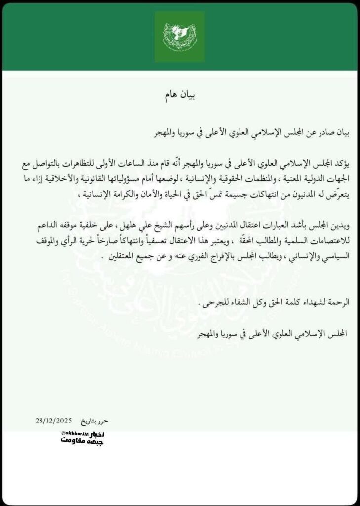 🔹 شام کی علوی اعلیٰ اسلامی کونسل اس بات پر زور دیتی ہے کہ مظاہروں کے ابتدائی لمحات ہی سے اس نے متعلقہ بین الاقوامی اداروں اور انسانی و حقوقِ انسانی تنظیموں سے رابطہ قائم کیا ہے، تاکہ انہیں ان کی قانونی اور اخلاقی ذمہ داریوں کے حوالے سے متوجہ کیا جا سکے—خصوصاً اُن سنگین خلاف ورزیوں کے بارے میں جو عام شہریوں کے خلاف ہو رہی ہیں اور جو حقِ زندگی، سلامتی اور انسانی وقار کو خطرے میں ڈالتی ہیں۔
